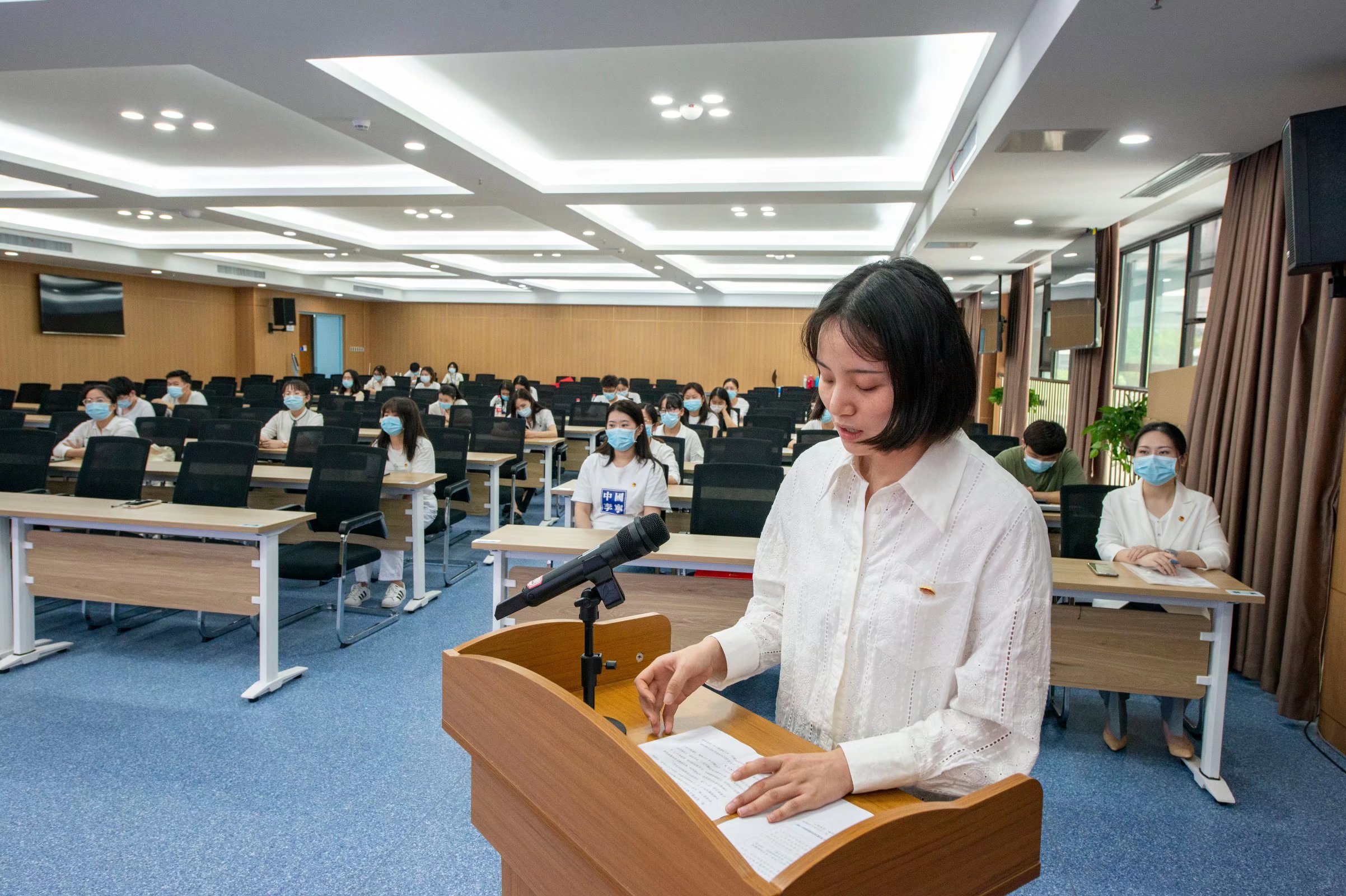 临床一团支部书记、90后青年党员、消化内科的黄羽同志作为一名共青团干部代表进行了发言。她谈到出发前告知家人准备报名驰援上海时,父母很支持她的决定,同时也充满了担忧,嘱咐要多注意安全。“4月3日清早出征,领导和同事们在广场欢送我们,当我穿上医院统一发的“战服”时,那一刻我感到特别骄傲和自豪。”黄羽分享道,方舱里有一位热心男子,在陪孩子写写画画讲故事之余,看到医护人员忙碌的身影,主动提出自己带了电脑,可以帮忙录入信息。虽然最终婉拒了他的好意,但大家心里都暖暖的。“相信在党的领导下,有全体医护人员的付出,有上海人民的全力配合,没有什么困难是克服不了的,我们一定能战胜疫情。”
