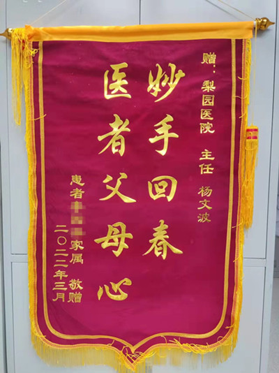 患者吴某,赠送锦旗一面,感谢血液科韩红主任。