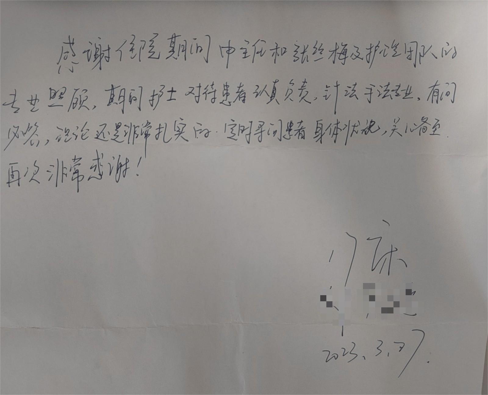 患者郑某,因“早期人工流产”入住妇产科治疗,住院期间,深刻感受到医护人员扎实的理论基础和专业的穿刺技术。非常感谢申利主任和张丝梅对患者关怀备至,让患者感受到家的温暖。