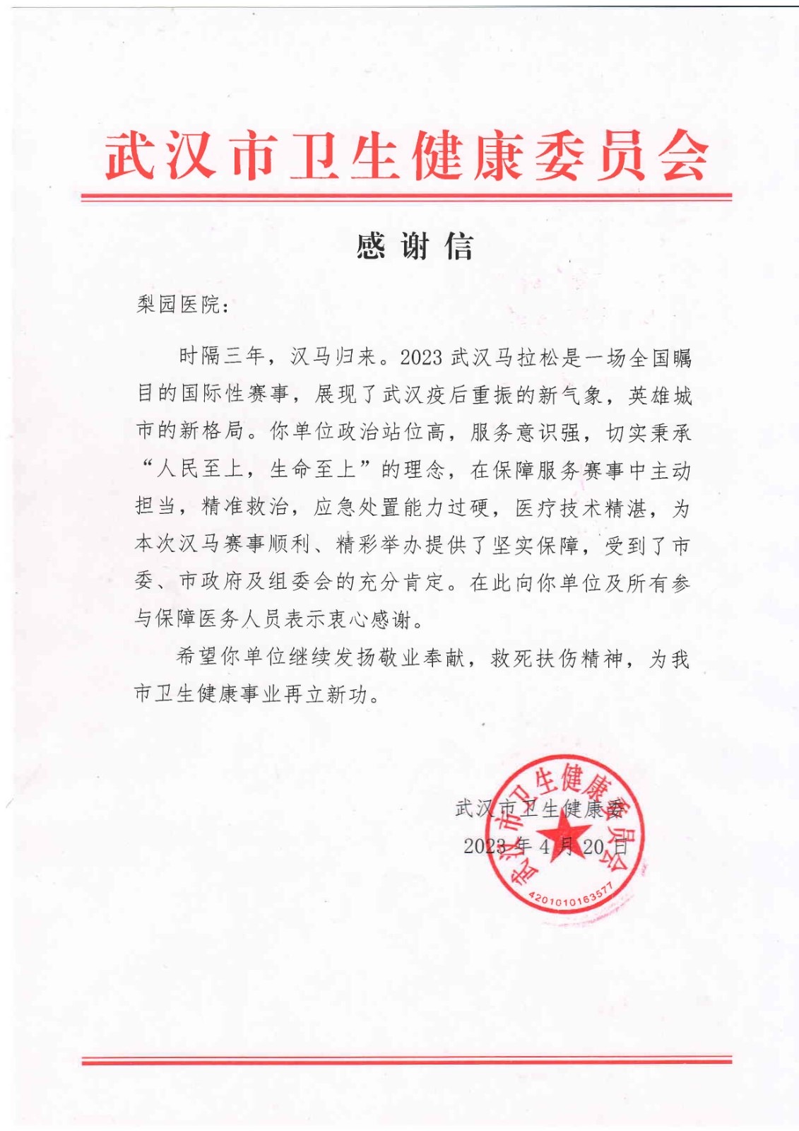 梨园医院在2023年武汉马拉松保障服务赛事中,主动担当精准救治,应急处置能力过硬,医疗技术精湛,为本次汉马赛事顺利、精彩举办,提供了坚实保障。武汉市卫健委特此发来感谢信。