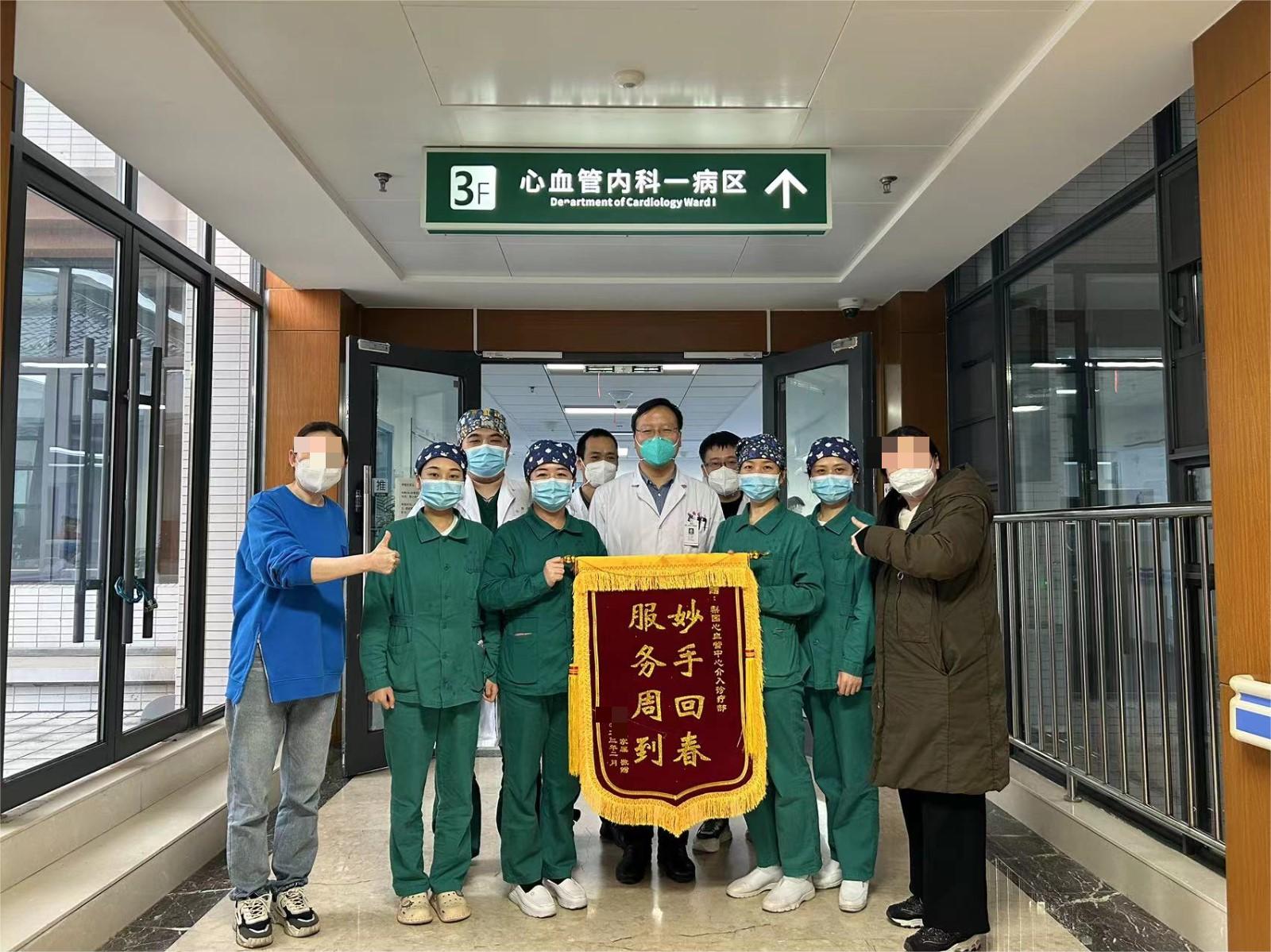 患者景某,73岁,因胸闷入住我院心血管临床医学中心CCU病房,诊断为急性心肌梗死。医生立刻进行急诊PCI,顺利开通了冠脉血管,抢救了病人的生命。经过全体医护人员的专业护理、悉心照顾,患者病情好转出院。患者及家属为表达感激之情,特地赠送锦旗给李正义主任、马志强医生及全体医护人员。